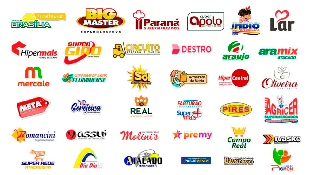 Nossa atuação inclui redes como Hipermais, Super Giro, Circuito Atacado e Varejo, Destro, Lar, Quadri, Paraná Araújo, Aramix, Supermercados Fluminense entre outras marcas expressivas em suas regiões.